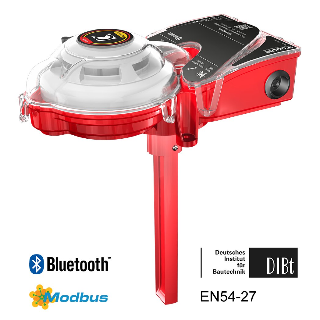 UG8-ZB-24 is DIBt-approved and comes with Bluetooth communication capabilities. Using the mobile APP, (CALECTRO ASSISITANT) available on both iOS and Android, detector status, contamination value and low airflow alarms can be viewed. The same information is also available using Modbus RTU. The settings for Modbus communication can be set using the push button and these are shown in the APP.